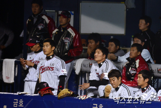 9회말 2사 LG 선수들이 더그아웃에서 경기를 지켜보고 있다.