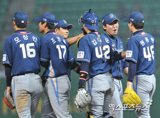 승리를 거둔 NC 선수들이 마운드에 모여 하이파이브 하고 있다.