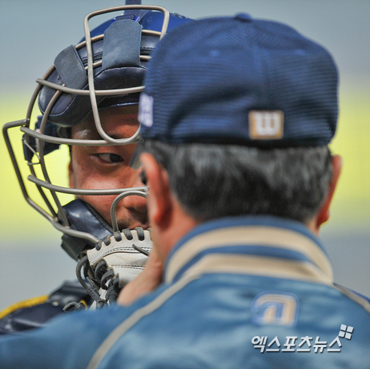 NC가 5-3으로 앞선 9회말 2아웃 만루 위기, NC 김경문 감독이 배터리 김태군을 불러 작전을 이야기 하고 있다.