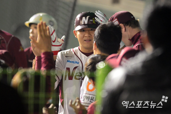 [엑스포츠뉴스=김한준 기자] 24일 오후 서울 목동야구장에서 열린 '2014 한국야쿠르트 세븐 프로야구' 롯데 자이언츠와 넥센 히어로즈의 경기, 3회말 넥센 김민성이 솔로홈런을 친 후 더그아웃에서 하이파이브를 하고 있다.