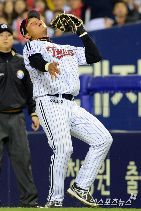 [엑스포츠뉴스=김한준 기자] 25일 오후 서울 송파구 잠실야구장에서 열린 '2014 한국야쿠르트 세븐 프로야구' KIA 타이거즈와 LG 트윈스의 경기, 5회초 2사 만루 LG 최승준이 KIA 나지완의 타구를 잡아내고 있다.