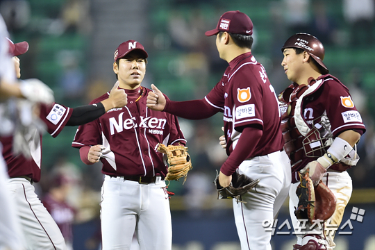 승리를 거둔 넥센 선수들이 마운드에 모여 세리머니를 하고 있다.