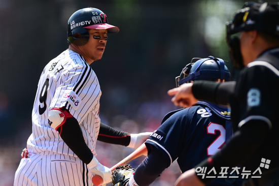 [엑스포츠뉴스=김한준 기자] 5일 오후 서울 송파구 잠실야구장에서 열린 '2014 한국야쿠르트 세븐 프로야구' 두산 베어스와 LG 트윈스의 경기, 1회말 2사 2루 LG 이병규가 스트라이크 낫 아웃을 당한 후 아쉬워하고 있다.