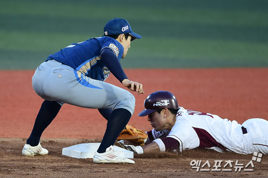 [엑스포츠뉴스=김한준 기자] 8일 오후 서울 목동야구장에서 열린 '2014 한국야쿠르트 세븐 프로야구' NC 다이노스와 넥센 히어로즈의 경기, 3회말 무사 1루 넥센 서건창이 2루 도루에 성공하고 있다.