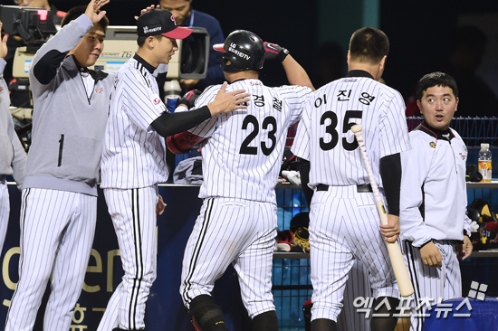 [엑스포츠뉴스=김한준 기자] 13일 오후 서울 송파구 잠실야구장에서 열린 '2014 한국야쿠르트 세븐 프로야구' 롯데 자이언츠와 LG 트윈스의 경기, 5회말 2사 LG 최경철이 솔로홈런을 날린 후 더그아웃에서 선수들과 하이파이브를 하고 있다.
