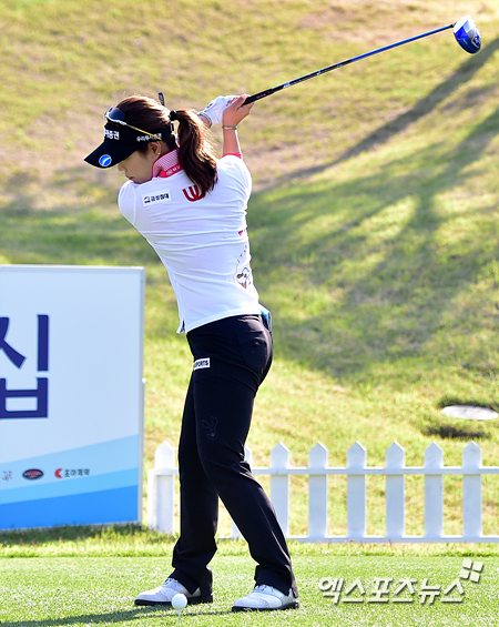 [엑스포츠뉴스=포천, 권혁재 기자] 17일 경기도 포천시 일동레이크 골프클럽 마운틴·힐 코스(파72·6천509야드)에서 열린 KLPGA 투어 '2014 WOORI 우리투자증권 레이디스 챔피언십'(총상금 5억원, 우승상금 1억원) 2라운드 경기, 이승현(23, 우리투자증권)이 10번 홀 티샷을 위해 연습스윙을 하고 있다.