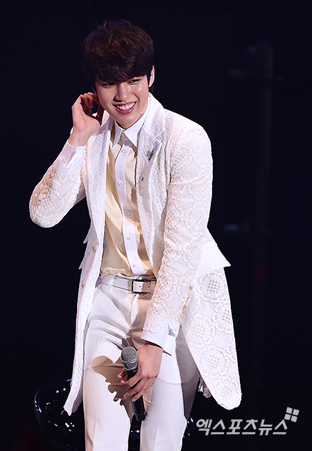 [엑스포츠뉴스=김한준 기자] 21일 오후 서울 송파구 잠실실내체육관에서 열린 '인피니트 1.2.3 쇼케이스'에 참석한 인피니트 성열이 눈빛연기를 선보인 후 부끄러워하고 있다.