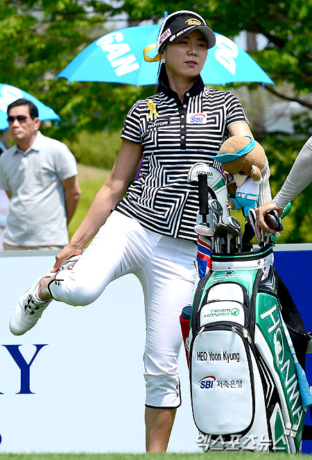 [엑스포츠뉴스=춘천 권태완 기자] 22일 오전 강원도 춘천시 라데나골프클럽에서 열린 '두산 매치플레이 챔피언쉽' 64강전에 허윤경이 1번홀 티샷전 골프화를 조이고 있다.