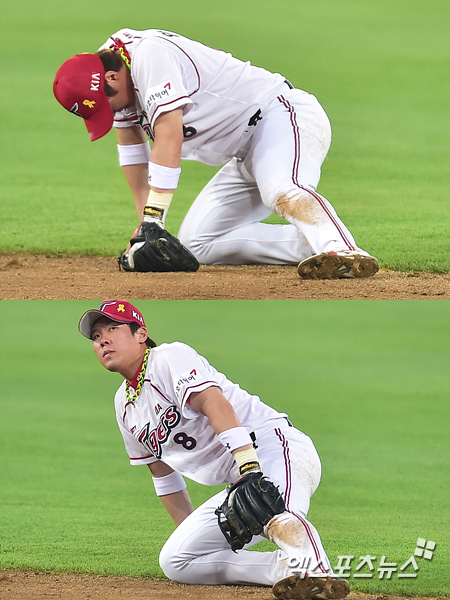 [엑스포츠뉴스=광주, 권혁재 기자] 22일 오후 광주-KIA챔피언스필드에서 열린 '2014 한국야쿠르트 세븐 프로야구' LG 트윈스와 KIA 타이거즈의 경기, LG가 4-0으로 앞선 3회초 2아웃 3루 KIA 2루수 안치홍이 LG 최경철의 타구를 잡았다 놓쳐 3루주자 이병규(7)는 홈인 타자주자도 세이프 되자 고개를 떨군채 그라운드에 주저앉아 있다.
