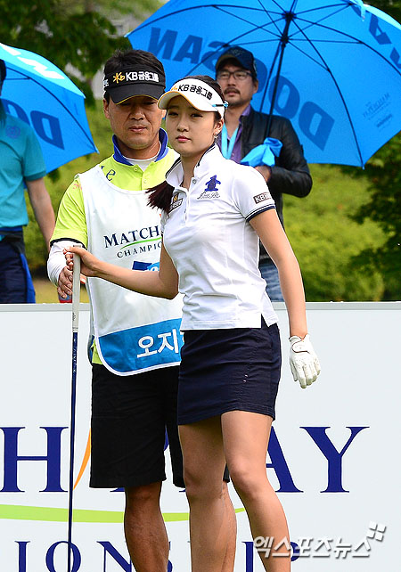 [엑스포츠뉴스=춘천 권태완 기자] 23일 오전 강원도 춘천시 라데나골프클럽에서 열린 '2014 두산 매치플레이 챔피언쉽' 32강전에 오지현(18, KB금융그룹)이 1번홀 티샷준비를 하고 있다.