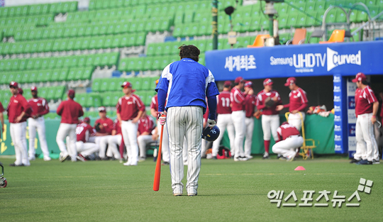 [엑스포츠뉴스=대구, 권혁재 기자] 23일 오후 대구시민운동장야구장에서 열린 '2014 한국야쿠르트 세븐 프로야구' 넥센 히어로즈와 삼성 라이온즈의 경기, 경기전 훈련중이던 삼석 박석민이 그라운드에 나온 넥센 선수들을 향해 인사하고 있다.
