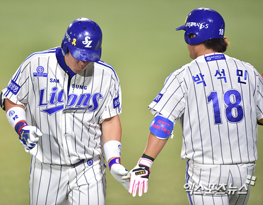 [엑스포츠뉴스=대구, 권혁재 기자] 23일 오후 대구시민운동장야구장에서 열린 '2014 한국야쿠르트 세븐 프로야구' 넥센 히어로즈와 삼성 라이온즈의 경기, 삼성이 4-0으로 앞선 6회말 2아웃 솔로포를 날린 삼성 최형우가 박석민과 하이파이브 하고 있다.
