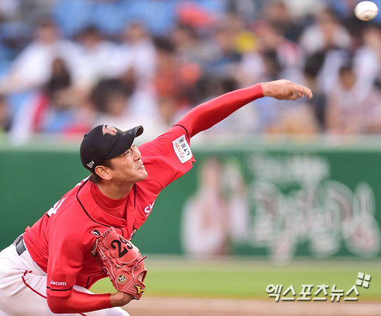 [엑스포츠뉴스=대전, 권혁재 기자] 30일 오후 대전 한밭야구장에서 열린 '2014 한국야쿠르트 세븐 프로야구' SK 와이번스와 한화 이글스의 경기, SK 선발투수 김광현이 힘차게 공을 던지고 있다.
