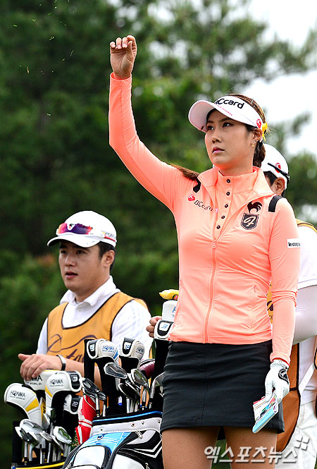 [엑스포츠뉴스=제주 권태완 기자] 6일 오후 제주도 롯데 스카이힐 CC 제주에서 열린 'KLPGA 제4회 롯데칸타타 여자오픈' 1라운드 경기에 김하늘(26, 비씨카드)이 8번홀 티샷 전 잔디를 날려 바람을 체크하고 있다.
