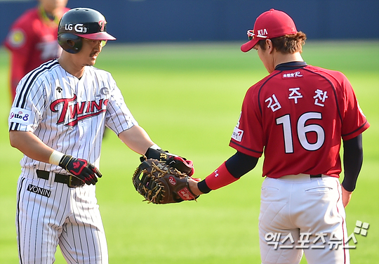 [엑스포츠뉴스=권혁재 기자] 6일 오후 서울 송파구 잠실야구장에서 열린 '2014 한국야쿠르트 세븐 프로야구' KIA 타이거즈와 LG 트윈스의 경기, 3회말 1아웃 우중간 2루타를 날린 LG 박용택이 1루로 돌아가는 KIA 1루수 김주찬의 요구에 장비를 건네주고 있다.