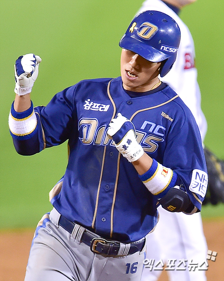 [엑스포츠뉴스=권혁재 기자] 10일 오후 서울 송파구 잠실야구장에서 열린 '2014 한국야쿠르트 세븐 프로야구' NC 다이노스와 두산 베어스의 경기, NC가 6-4로 앞선 9회초 NC 모창민이 중월 솔로포를 날리고 주먹을 불끈쥐며 그라운드를 달리고 있다.