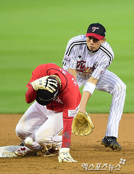 [엑스포츠뉴스=김한준 기자] 13일 오후 서울 송파구 잠실야구장에서 열린 '2014 한국야쿠르트 세븐 프로야구' SK 와이번스와 LG 트윈스 경기, 5회초 2사 1, 3루 SK 김강민이 2루 도루를 시도하고 있다.