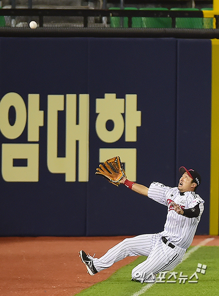 [엑스포츠뉴스=김한준 기자] 13일 오후 서울 송파구 잠실야구장에서 열린 '2014 한국야쿠르트 세븐 프로야구' SK 와이번스와 LG 트윈스 경기, 7회초 LG 이병규가 SK 이명기의 파울타구를 잡기위해 슬라이딩을 하고 있다.