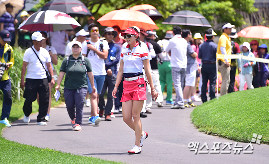 [엑스포츠뉴스=제주, 권혁재 기자] 15일 오전 제주시 애월읍 엘리시안 제주 컨트리클럽에서 열린 KLPGA ‘S-OIL 챔피언스 인비테이셔널’(총상금 6억원, 우승상금 1억2,000만원) 3라운드 경기, 윤채영(27, 한화)이 1번 홀 세컨샷을 위해 이동하고 있다.