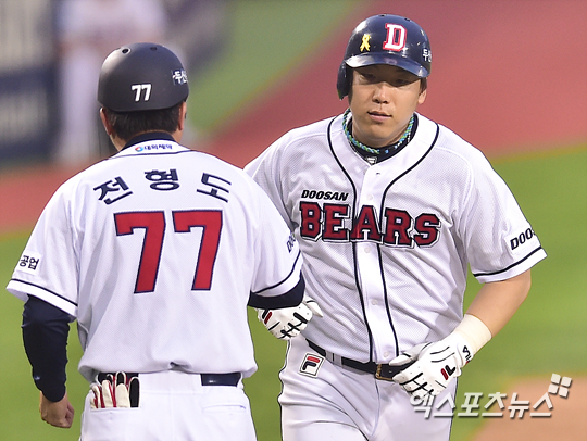 [엑스포츠뉴스=권혁재 기자] 17일 오후 서울 송파구 잠실야구장에서 열린 '2014 한국야쿠르트 세븐 프로야구' LG 트윈스와 두산 베어스의 경기, LG가 4-0으로 앞선 4회말 1아웃 1루 두산 김현수가 좌월 투런홈런을 날리고 그라운드를 달리며 3루 코치와 하이파이브 하고 있다.