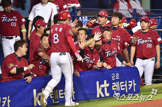 [엑스포츠뉴스=권혁재 기자] 20일 오후 서울 송파구 잠실야구장에서 열린 '2014 한국야쿠르트 세븐 프로야구' KIA 타이거즈와 두산 베어스의 경기, 8회초 선두타자 KIA 안치홍이 좌중월 솔로포를 날리고 들어와 동료들과 하이파이브 하고 있다.