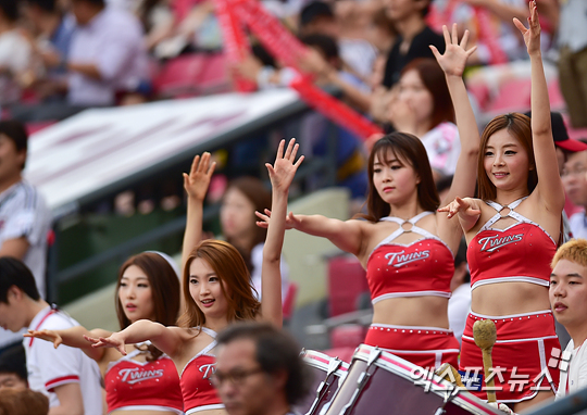 [엑스포츠뉴스=권혁재 기자] 26일 오후 송파구 잠실야구장에서 열린 '2014 한국야쿠르트 세븐 프로야구' NC 다이노스와 LG 트윈스의 경기, LG 치어리더들이 열띤 응원전을 펼치고 있다.