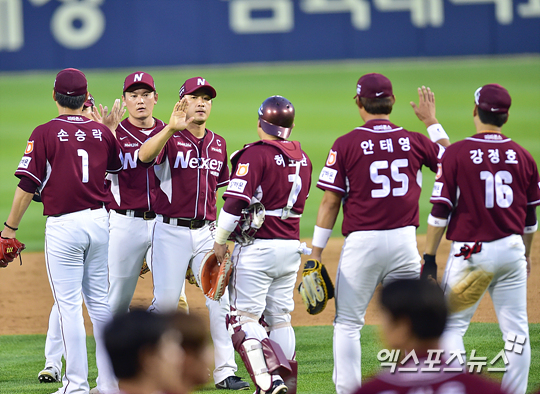 승리를 거둔 넥센 선수들이 마운드에 모여 하이파이브 하고 있다.