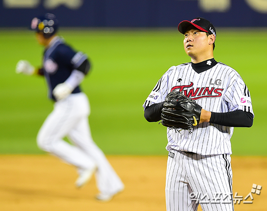 [엑스포츠뉴스=김한준 기자] 10일 오후 서울 송파구 잠실야구장에서 열린 '2014 한국야쿠르트 세븐 프로야구' 두산 베어스와 LG 트윈스의 경기, 5회초 2사 1루 LG 선발투수 류제국이 두산 홍성흔에게 투런홈런을 맞은 후 아쉬워하고 있다.