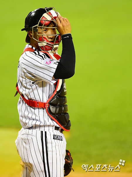 [엑스포츠뉴스=김한준 기자] 10일 오후 서울 송파구 잠실야구장에서 열린 '2014 한국야쿠르트 세븐 프로야구' 두산 베어스와 LG 트윈스의 경기, 9회초 수비때 LG 박경수가 포수 마스크를 쓰고 있다.