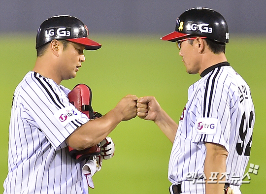 [엑스포츠뉴스=권혁재 기자] 15일 오후 서울 송파구 잠실야구장에서 열린 '2014 한국야쿠르트 세븐 프로야구' 삼성 라이온즈와 LG 트윈스의 경기, LG가 4-1로 앞선 8회말 2아웃 만루 싹쓸이 2루타를 날린 LG 최경철이 김민호 코치와 하이파이브 하고 있다.