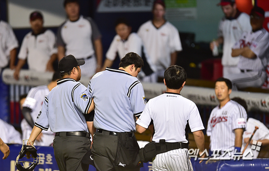 [엑스포츠뉴스=권혁재 기자] 28일 오후 서울 송파구 잠실야구장에서 열린 '2014 한국야쿠르트 세븐 프로야구' 롯데 자이언츠와 LG 트윈스의 경기, 7회말 1아웃 1, 2루 대타로 나온 LG 정성훈의 파울 타구를 맞은 김정국 구심이 교체되고 있다.
