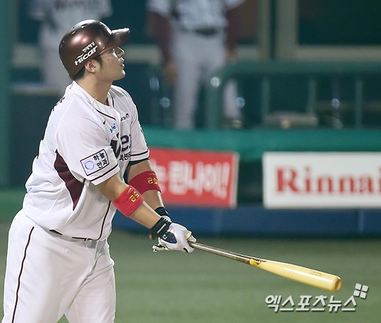 [엑스포츠뉴스=김한준 기자] 5일 오후 서울 목동야구장에서 열린 '2014 한국야쿠르트 세븐 프로야구' SK 와이번스와 넥센 히어로즈의 경기, 5회말 2사 1, 2루 넥센 박병호가 타격을 한 후 타구를 바라보고 있다.