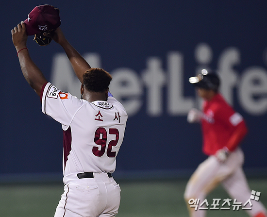 [엑스포츠뉴스=김한준 기자] 5일 오후 서울 목동야구장에서 열린 '2014 한국야쿠르트 세븐 프로야구' SK 와이번스와 넥센 히어로즈의 경기, 7회초 1사 1루 넥센 선발투수 헨리 소사가 SK 이명기에게 투런 홈런을 맞은 후 땀을 닦고 있다.