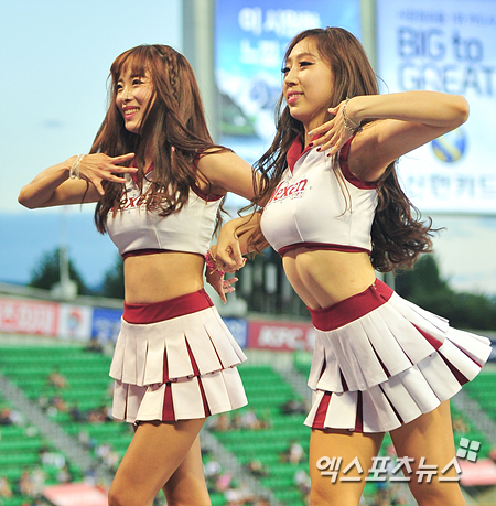 [엑스포츠뉴스=권혁재 기자] 8일 오후 서울 잠실야구장에서 열린 '2014 한국야쿠르트 세븐 프로야구' 넥센 히어로즈와 두산 베어스의 경기, 넥센 치어리더 김한나, 임경미가 아찔한 안무를 선보이고 있다.
