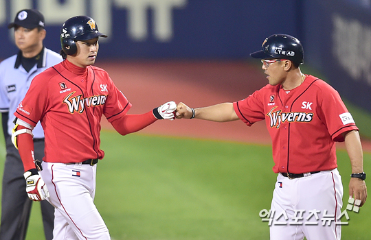 [엑스포츠뉴스=권혁재 기자] 12일 오후 서울 송파구 잠실야구장에서 열린 '2014 한국야쿠르트 세븐 프로야구' SK 와이번스와 LG 트윈스의 경기, SK가 2-1로 앞선 3회초 2아웃 만루 SK 임훈이 2타점 적시타를 날리고 1루 코치와 하이파이브 하고 있다.