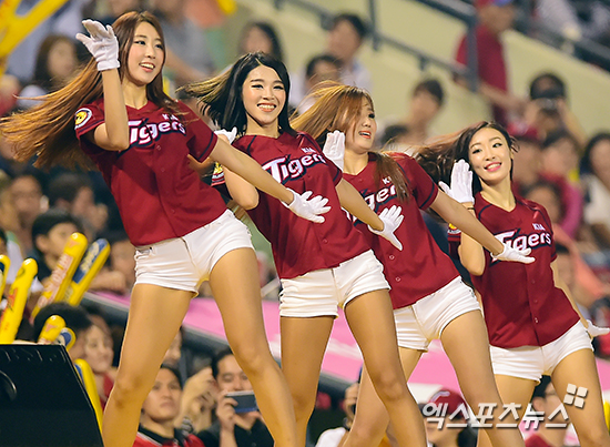 [엑스포츠뉴스=김한준 기자] 22일 오후 서울 송파구 잠실야구장에서 열린 '2014 한국야쿠르트 세븐 프로야구' KIA 타이거즈와 LG 트윈스의 경기, KIA 치어리더들이 열띤 응원을 펼치고 있다.