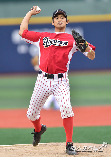 [엑스포츠뉴스=권혁재 기자] 25일 오후 서울 양천구 목동야구장에서 열린 프로야구 은퇴선수 협회와 연예인 야구단 올스타의 경기, B팀 선발투수 오지호가 힘차게 공을 던지고 있다.