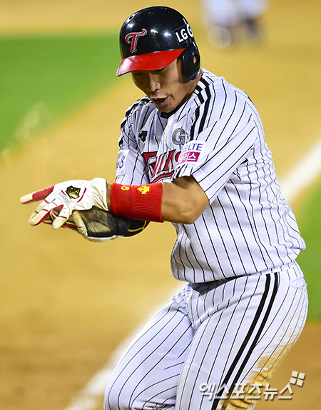 [엑스포츠뉴스=김한준 기자] 5일 오후 서울 송파구 잠실야구장에서 열린 '2014 한국야쿠르트 세븐 프로야구' 두산 베어스와 LG 트윈스의 경기, 5회말 1사 1,3루 LG 박경수가 이병규(7) 희생플라이때 언더베이스로 득점에 성공하고 있다.
