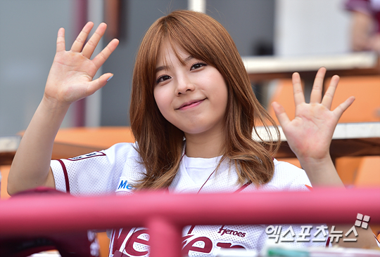 [엑스포츠뉴스=권혁재 기자] 7일 오후 서울 양천구 목동야구장에서 열린 '2014 한국야쿠르트 세븐 프로야구' 넥센 히어로즈와 롯데 자이언츠의 경기, 시구를 마친 싱어송라이터 주니엘이 관중석에서 포즈를 취하고 있다.