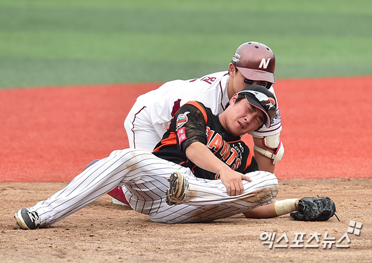 [엑스포츠뉴스=권혁재 기자] 7일 오후 서울 양천구 목동야구장에서 열린 '2014 한국야쿠르트 세븐 프로야구' 넥센 히어로즈와 롯데 자이언츠의 경기, 넥센이 7-6으로 앞선 8회말 2아웃 1루 좌전안타를 친 넥센 박동원이 2루 진루를 시도 슬라이딩하며 충돌한 롯데 2루수 정훈이 고통스러워 하고 있다.