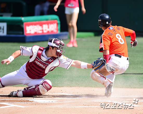 [엑스포츠뉴스=김한준 기자] 9일 오후 서울 목동야구장에서 열린 '2014 한국야쿠르트 세븐 프로야구' 한화 이글스와 넥센 히어로즈의 경기, 1회초 1사 3루 한화 정근우가 김경언의 희생플라이 타구때 언더베이스로 득점에 성공하고 있다.