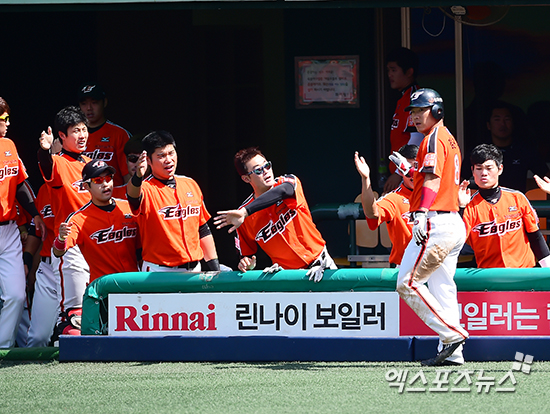 [엑스포츠뉴스=김한준 기자] 9일 오후 서울 목동야구장에서 열린 '2014 한국야쿠르트 세븐 프로야구' 한화 이글스와 넥센 히어로즈의 경기, 1회초 1사 3루 한화 정근우가 득점에 성공한 후 더그아웃에서 동료들과 하이파이브를 하고 있다.