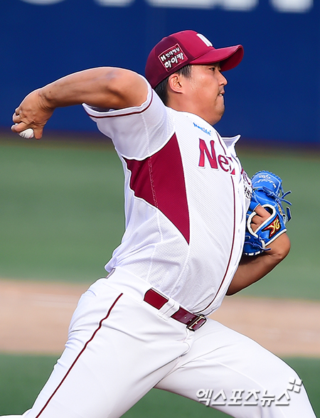 [엑스포츠뉴스=김한준 기자] 9일 오후 서울 목동야구장에서 열린 '2014 한국야쿠르트 세븐 프로야구' 한화 이글스와 넥센 히어로즈의 경기, 9회초 넥센 김영민이 공을 힘차게 던지고 있다.