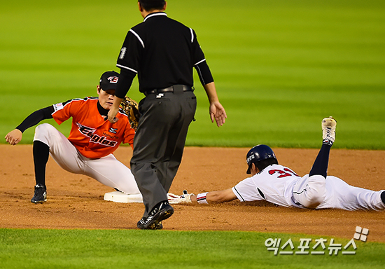 [엑스포츠뉴스=김한준 기자] 11일 오후 서울 송파구 잠실야구장에서 열린 '2014 한국야쿠르트 세븐 프로야구' 한화 이글스와 두산 베어스의 경기, 1회말 1사 1루 두산 정수빈이 2루 도루에 성공하고 있다.