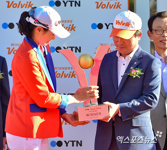 챔피언 이정민이 볼빅 문경안 회장으로부터 트로피를 건네받고 있다.