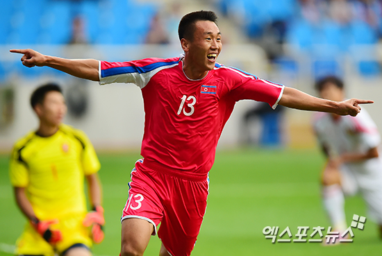 [엑스포츠뉴스=인천, 김한준 기자] 15일 오후 인천광역시 도원동 인천축구전용경기장에서 열린 '제17회 인천아시아경기대회(17th Asian Games Incheon 2014)' 남자축구 F조 예선 북한과 중국의 경기, 전반 북한 심현진이 골을 성공시킨 후 세리머니를 펼치고 있다.