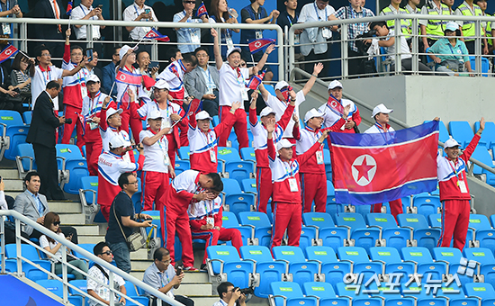 [엑스포츠뉴스=인천, 김한준 기자] 15일 오후 인천광역시 도원동 인천축구전용경기장에서 열린 '제17회 인천아시아경기대회(17th Asian Games Incheon 2014)' 남자축구 F조 예선 북한과 중국의 경기, 전반 북한 심현진이 골을 성공시키자 관중석에 있던 북한 응원단이 환호하고 있다.