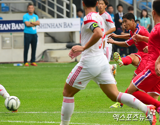 [엑스포츠뉴스=인천, 김한준 기자] 15일 오후 인천광역시 도원동 인천축구전용경기장에서 열린 '제17회 인천아시아경기대회(17th Asian Games Incheon 2014)' 남자축구 F조 예선 북한과 중국의 경기, 전반 북한 정인관이 오른발 슈팅을 시도하고 있다.