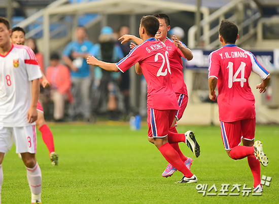 [엑스포츠뉴스=인천, 김한준 기자] 15일 오후 인천광역시 도원동 인천축구전용경기장에서 열린 '제17회 인천아시아경기대회(17th Asian Games Incheon 2014)' 남자축구 F조 예선 북한과 중국의 경기, 후반 북한 소경진이 골을 성공시킨 후 기뻐하고 있다.