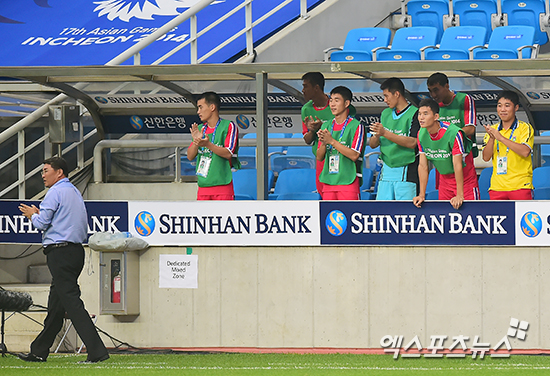 [엑스포츠뉴스=인천, 김한준 기자] 15일 오후 인천광역시 도원동 인천축구전용경기장에서 열린 '제17회 인천아시아경기대회(17th Asian Games Incheon 2014)' 남자축구 F조 예선 북한과 중국의 경기, 후반 북한 소경진의 추가골에 북한 벤치가 기뻐하고 있다.